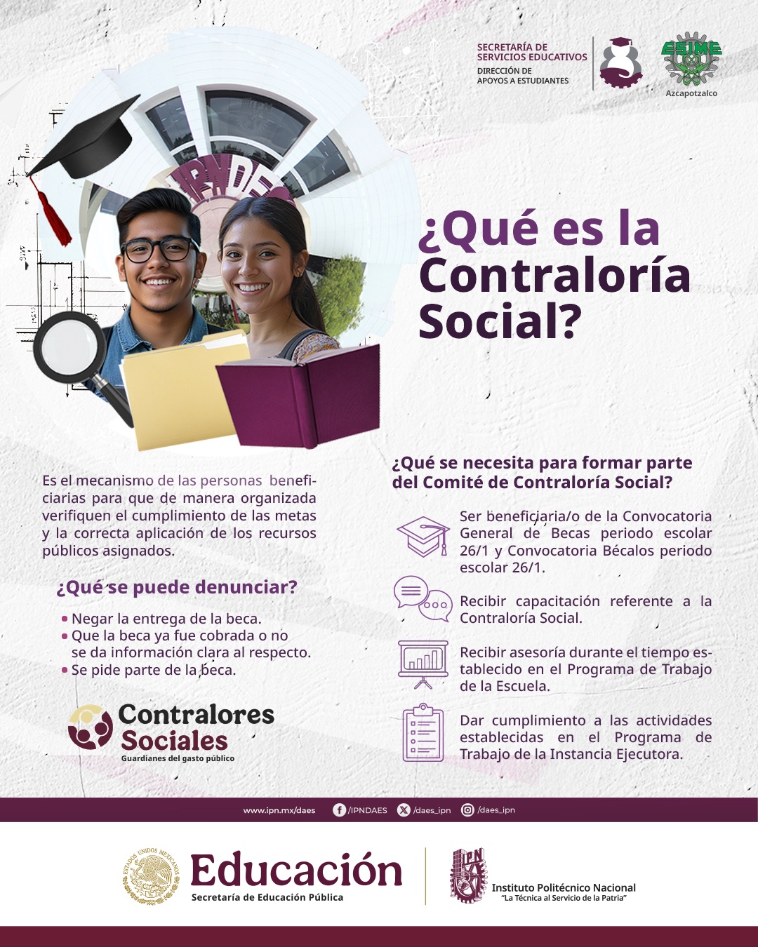 La Contraloría Social en la Escuela Superior de Ingeniería Mecánica y Eléctrica Unidad Azcapotzalco (ESIME Azcapotzalco), del Instituto Politécnico Nacional (IPN) es un mecanismo de participación ciudadana que permite a las y los beneficiarios de los programas federales de desarrollo social vigilar que los recursos públicos se apliquen con transparencia, legalidad, eficacia, eficiencia, honradez y equidad.